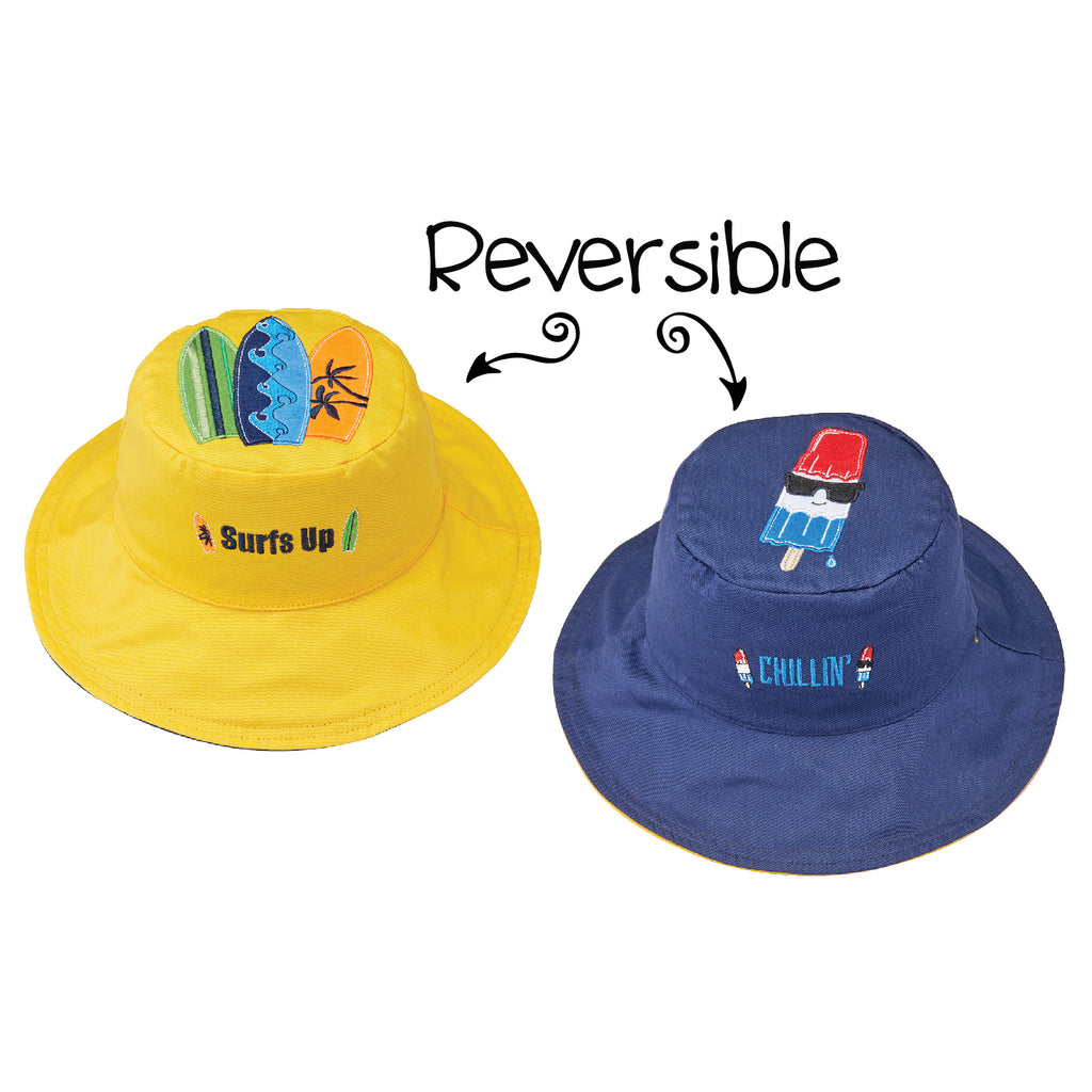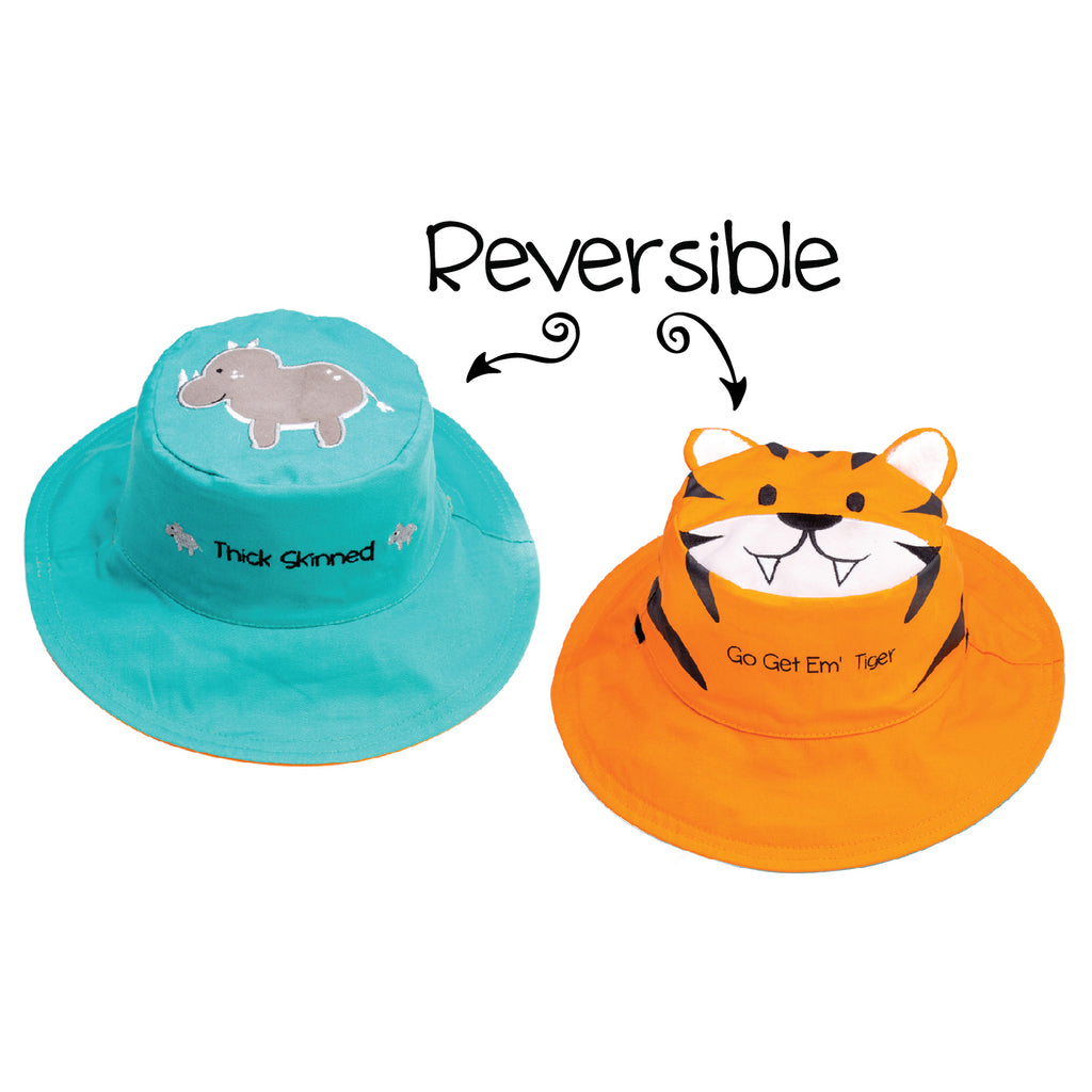 Our reversible kids' patterned sun hats are lightweight, super soft, splash-proof and have adorable patterns on both sides. The chin straps fit snugly through the adjacent eyelets, making our hats practical to wear on either side. UPF 50+ offers maximum sun protection for your child’s head, ears and neck.